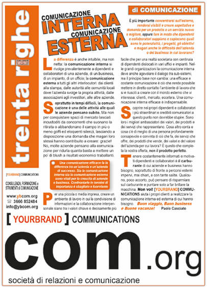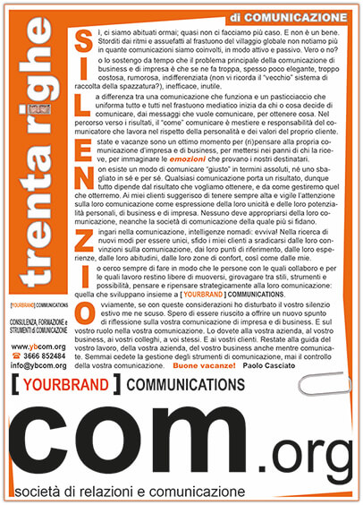 Trenta righe (di Comunicazione) ospita approfondimenti - brevi - su comunicazione, relazioni, marketing. Per informazioni contattate Paolo Casciato.
